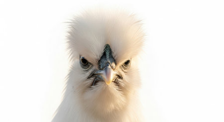close up of a white chicken isolated on a white background with copy space