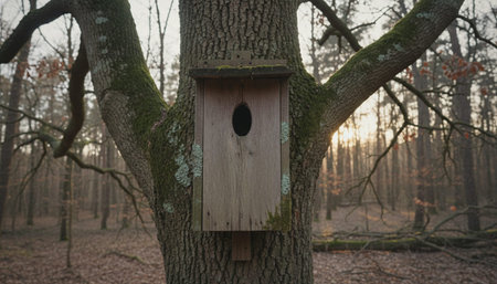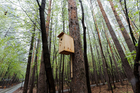 wooden birdhouse mounted on a tree trunk, taking care of the birds