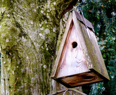 A small wooden box for birds ( nesting box or birdhouse) in a tree in the spring. Old bird house hanging on a tree. Handmade birdhouse.