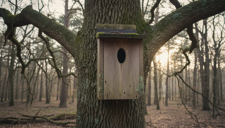 In the midst of a lush forest, a charming birdhouse is suspended from the sturdy branches of a tree, providing a cozy home for birds seeking shelter and safety in their natural habitat
