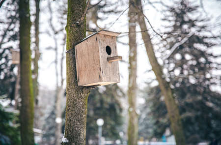 Single beautiful wooden birdhouse on a tree. Sunny winter. Brown food birdhouse forest scene. Animal life care welcome home theme.