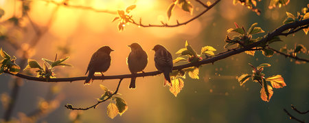 Panoramic portrait of small funny birds sparrows sitting on a tree branch in a Sunny summer garden