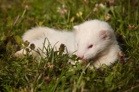 Ferret baby in summer grass enjoying their walk and game in park