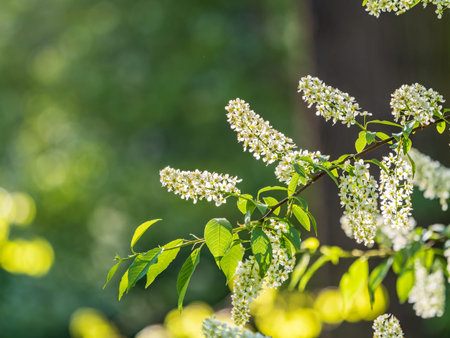 flowering bird cherry, a plant with the Latin name Prunus padus, macro, branches illuminated by the sun