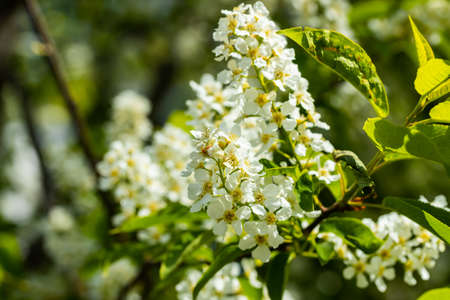 Bird cherry blossom. Lush white flowers in spring. Fresh green tree leaves.