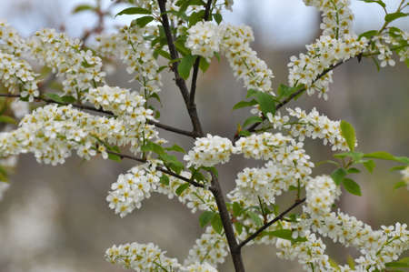 White flowers on the branches of a blossoming bird cherry in spring