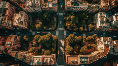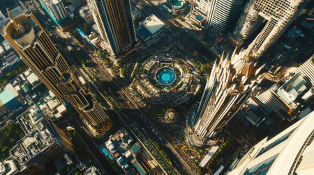 Captivating aerial view showcasing bustling city life with towering skyscrapers and lively streets. A perfect representation of modern urban dynamics and architecture.