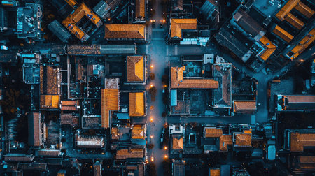 Stunning aerial view of a bustling urban cityscape at dusk, showcasing towering skyscrapers illuminated by city lights. The intricate layout reveals dynamic energy and architectural beauty.