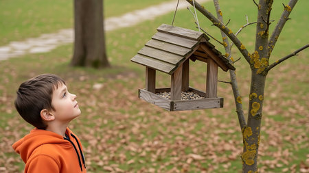 A boy in an orange hoodie gazes up at a wooden bird feeder.