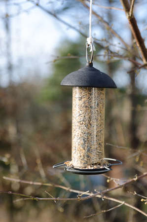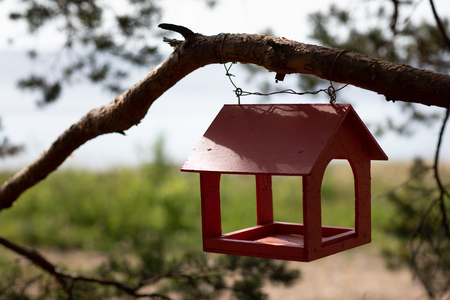 Bird feeder on the background of the spring forest. Brown tone.