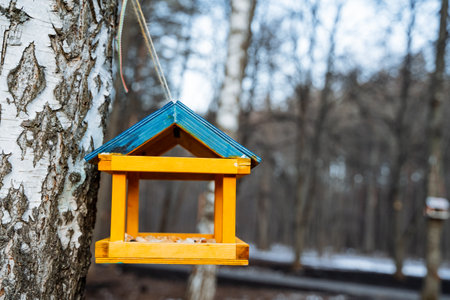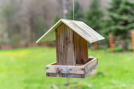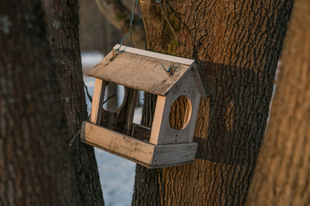 Bird feeder in the forest in the form of a house. Ornithology.