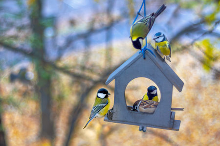 Titmice surround birdhouse as sparrow helps itself to their food. The scene captures different reactions of birds, showcasing glimpse of natures interactions