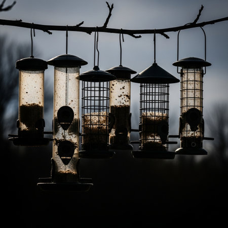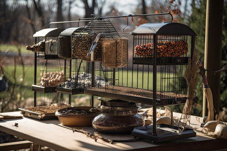 bird feeding station with variety of feeders and treats, including sunflower seeds, nuts, and berries, created with generative ai