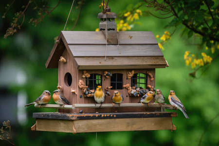 busy birdhouse and feeder, with multiple birds visiting, created with generative ai
