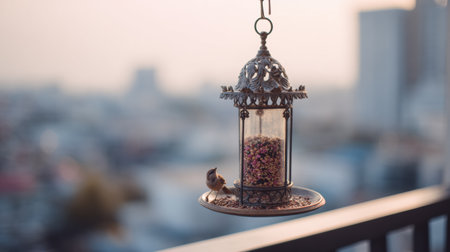 A small bird enjoys seeds from an elegant feeder on a balcony, with a blurred city skyline in the background under the warm glow of dusk.