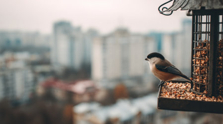 A bird is feeding on seeds from an elegant feeder on a balcony, while a blurred city skyline serves as a backdrop, enhancing the urban atmosphere.