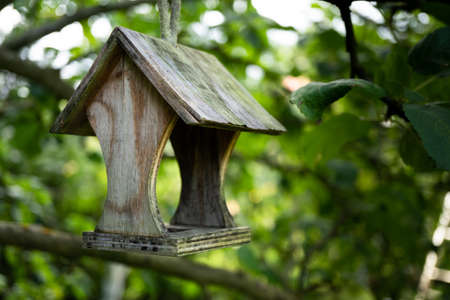homemade wooden bird feeder weighs on a tree in a park on a summer day