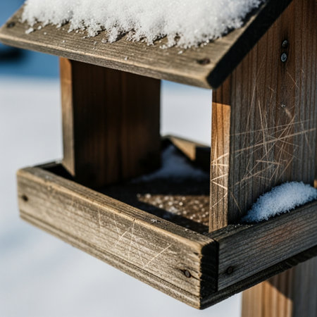 Weathered, empty bird feeder lightly dusted with fresh snow, captured with a cinematic Dutch angle.