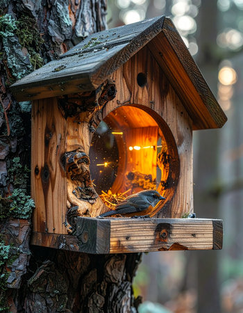 Tucked away in a quiet corner of an enchanted forest, a tiny, handcrafted wooden house glows with a warm, inviting light.