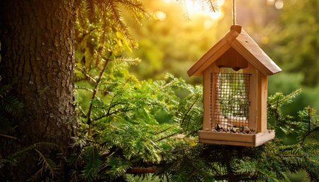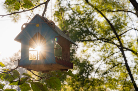 Handmade wooden birdhouse hanging on a tree in a sunny park. Perfect symbol of eco-lifestyle, gardening, and nature care. Spring outdoor concept, wildlife-themed designs