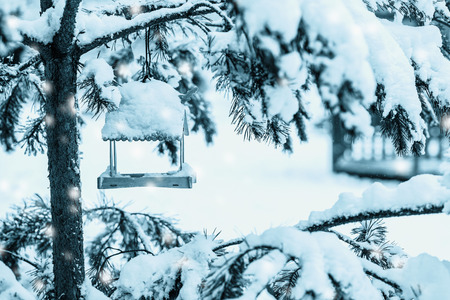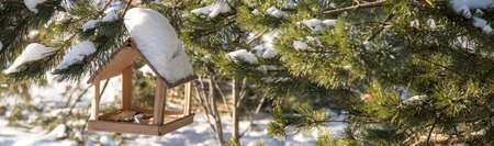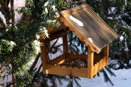 Winter wooden bird feeder close-up green in evergreen coniferous fir branches in a snowy park