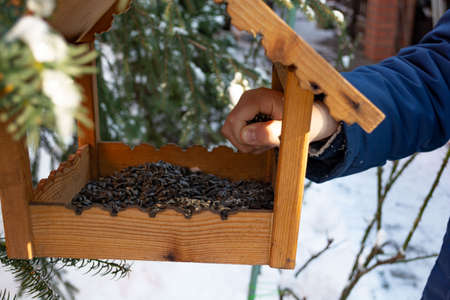 Man keeping at the tree birds feeder and preparing to the feeding birds