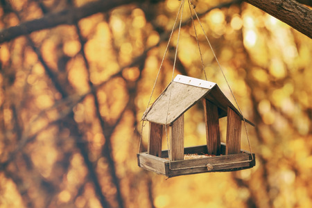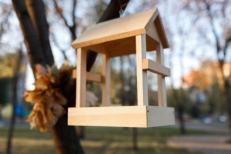 Wooden bird feeder on a tree branch in autumn park. Birdhouse on a rope