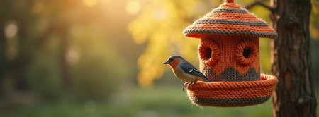 Charming autumn bird on knitted birdhouse in sunlit forest.