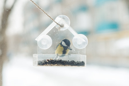 a tit sits and eats seeds from a transparent feeder on the window