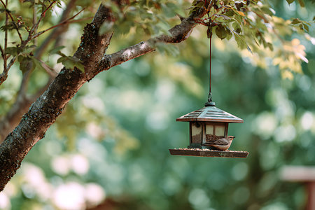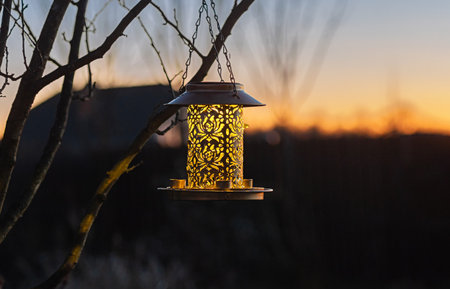 Illuminated golden bird feeder lantern hanging on tree in soft evening backyard light. Stylish outdoor decor, glows warmly at dusk, highlights the beauty of nature and garden design.
