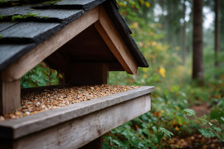 Bird feeder providing food for birds in a forest during autumn