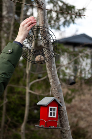 A person's hand places a bird food ball into a hanging feeder on a tree, with a red house-shaped bird feeder below, in a natural garden setting.