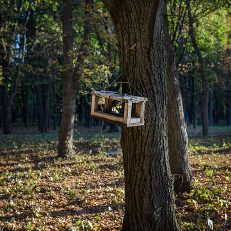 Bird feeder. There is a bird feeder on a tree in an autumn park. The feeder is made of wood.