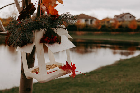 decorative house hanging single object in garden autumn foliage blurred background space