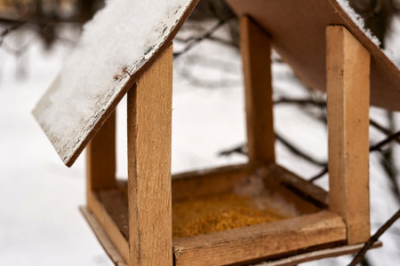 Feeder with sprinkled cereal, feeding birds in winter