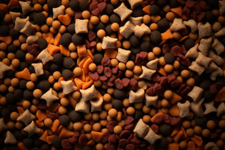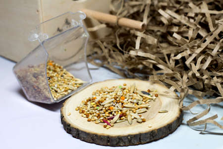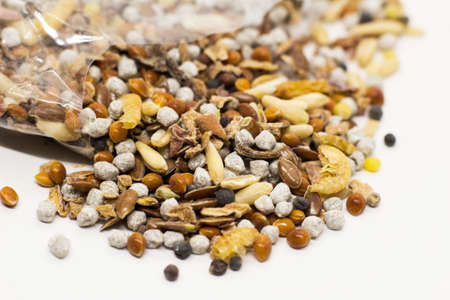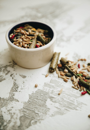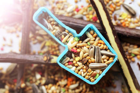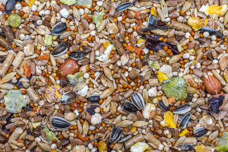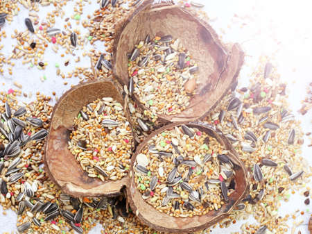 Parrot fodder background of dried fruits, nuts and seed mix. Healthy food for pets.