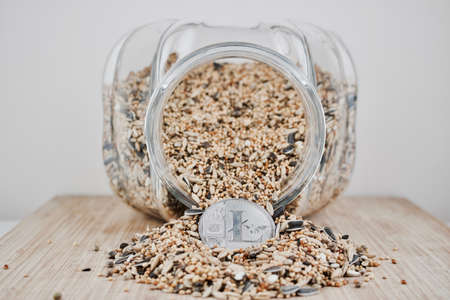 Digital currency physical silver Litecoin coin in fresh seeds from jar.