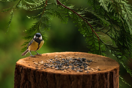 Great tit, Parus major, feeding on sunflower seeds from a man-made birdfeeder.