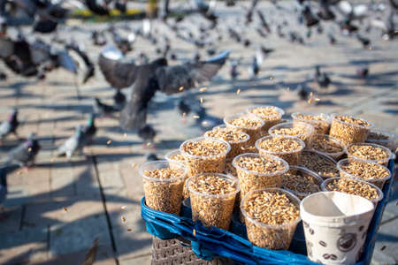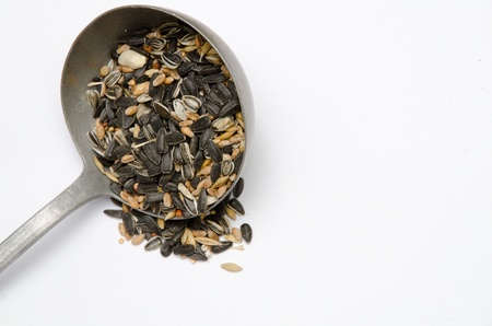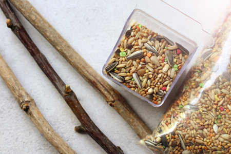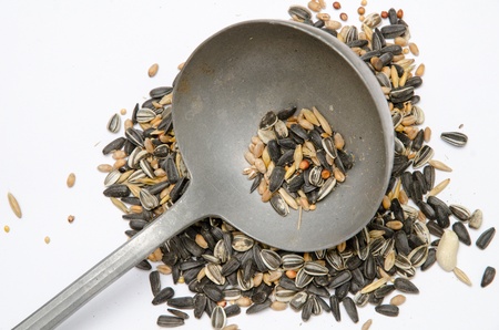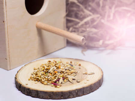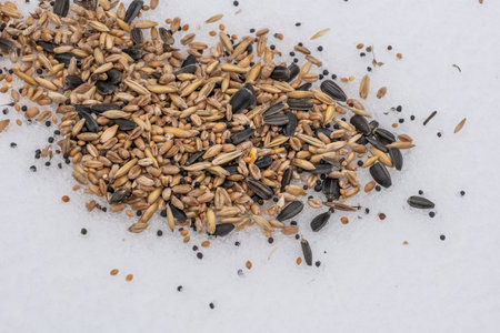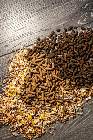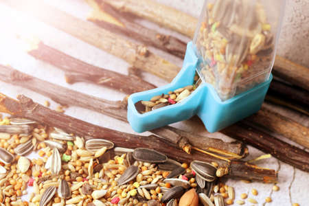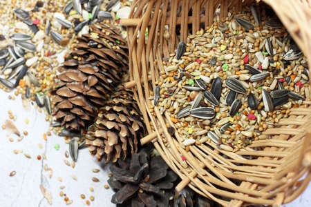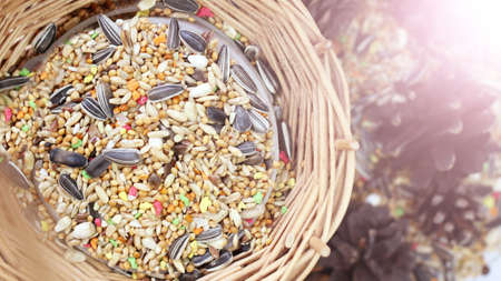 bird food for winter feeding, mixed seeds like sunflower, corn, millet and more are falling out of a bowl on a rustic wooden board, copy space, motion blur, selected focus, narrow depth of field