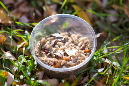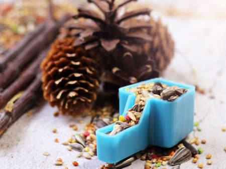 unique homemade manual bird feeder, winter garden. The bird feeder in the shape of a star formed from different types of grains. Protection of wild birds in nature during the cold season.