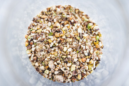 homemade dukkah with pistachios cashews and mixed seeds, concept of simple natural healthy ingredients