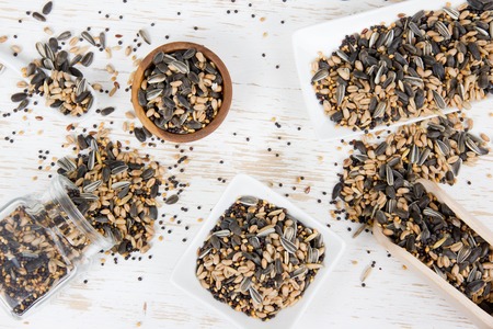 Food for birds for the winter. Seeds, millet, nuts, ghee in a bowl for making a feeder on a wooden white background.