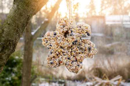 Homemade cookie made from seeds and cereals on a tree branch for the birds. Care of animals and birds during winter season. Wintertime activity for family with kids