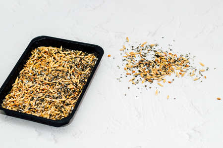 Mix different seeds for a healthy salad, bowl on a gray concrete background