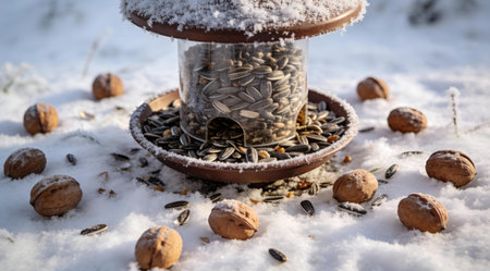 close-up of a bird feeder overflowing with seeds, created with generative ai