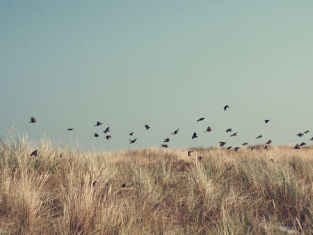 Flock of birds, beautiful sparrows over dune grass, Baltic Sea, Beauty of Nature