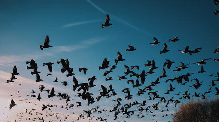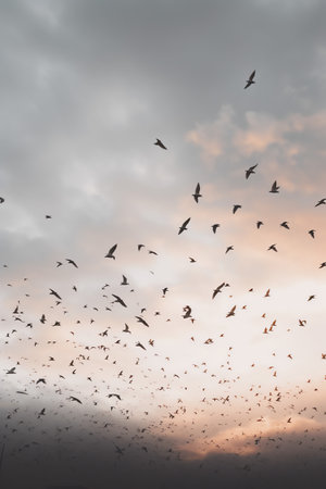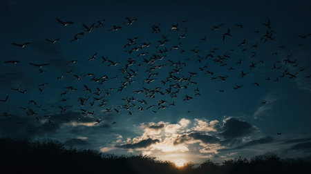 A flock of birds silhouetted against a moody sky, creating a dynamic and serene atmosphere of nature in flight.