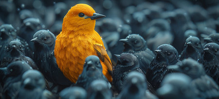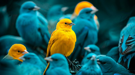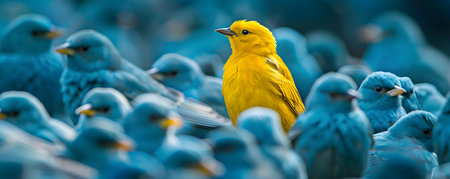 Standing Out: The Yellow Bird Amongst Blue Birds Representing Individuality and Courage. Concept Individuality, Courage, Standing Out, Yellow Bird, Blue Birds