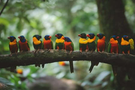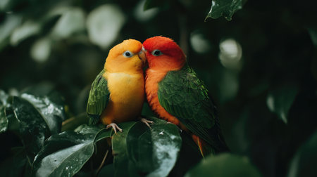 A charming scene featuring two colorful tropical birds expressing affection amidst vibrant green foliage. This intimate moment captures the beauty of nature's wildlife.
