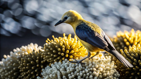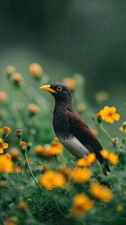 A dark-colored bird with a yellow beak and eye ring is observed among small yellow flowers, set against a blurred green backdrop. The natural lighting highlights the details of the bird's feathers and the texture of the flower petals. This image could be used for various projects needing a touch of nature.